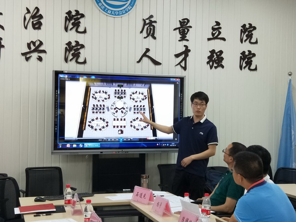 实验室主任石道元老师对智能财务共享实验室建设方案进行了详细的介绍与汇报。经过提问和沟通,专家组对实验室建设方案和情况提出了许多中肯的意见和建议。随后所有参会人员到实验室进行了实地考察,并对建设方案的合理性、目标实现的可能性、相关设备配置的可拓展性、组织实施条件的完备性等方面发表了看法。