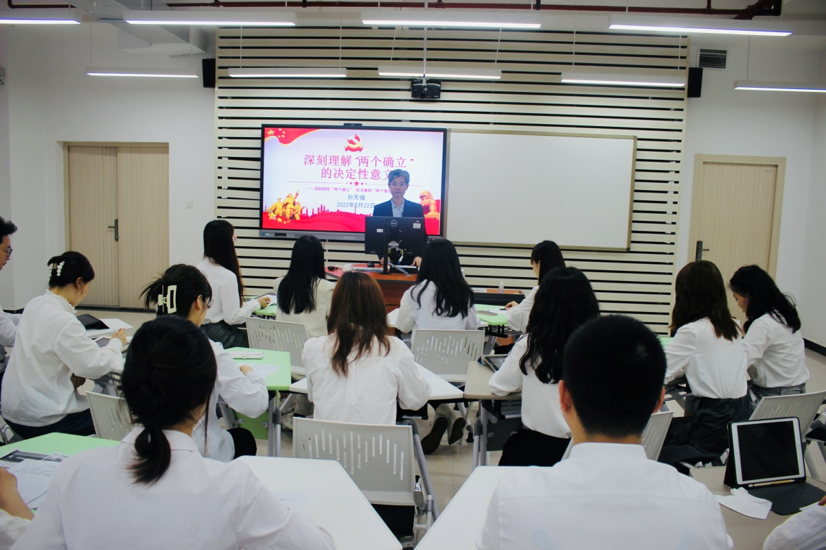 孙芳城结合党的百年奋斗历程和当今国内外复杂多变的形势,阐述了“两个确立”的决定性意义,并通过生动事例说明,正是有了以习近平同志为核心的党中央坚强的领导,我们的国家才能取得抗击新冠肺炎疫情斗争重大战略成果,才能全面建成小康社会,才能在中华大地上消除绝对贫困,才能从容挫败霸权国家强加给我们的贸易战,并有效化解中国周边的军事挑衅,实现了国家繁荣、社会安定、人民安康。