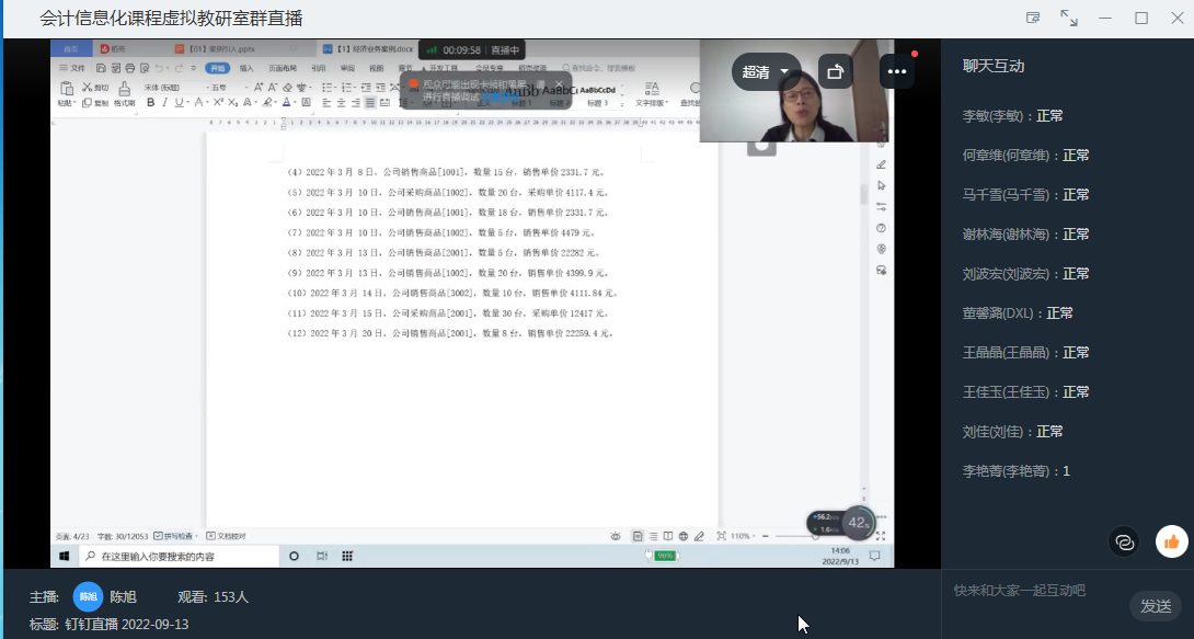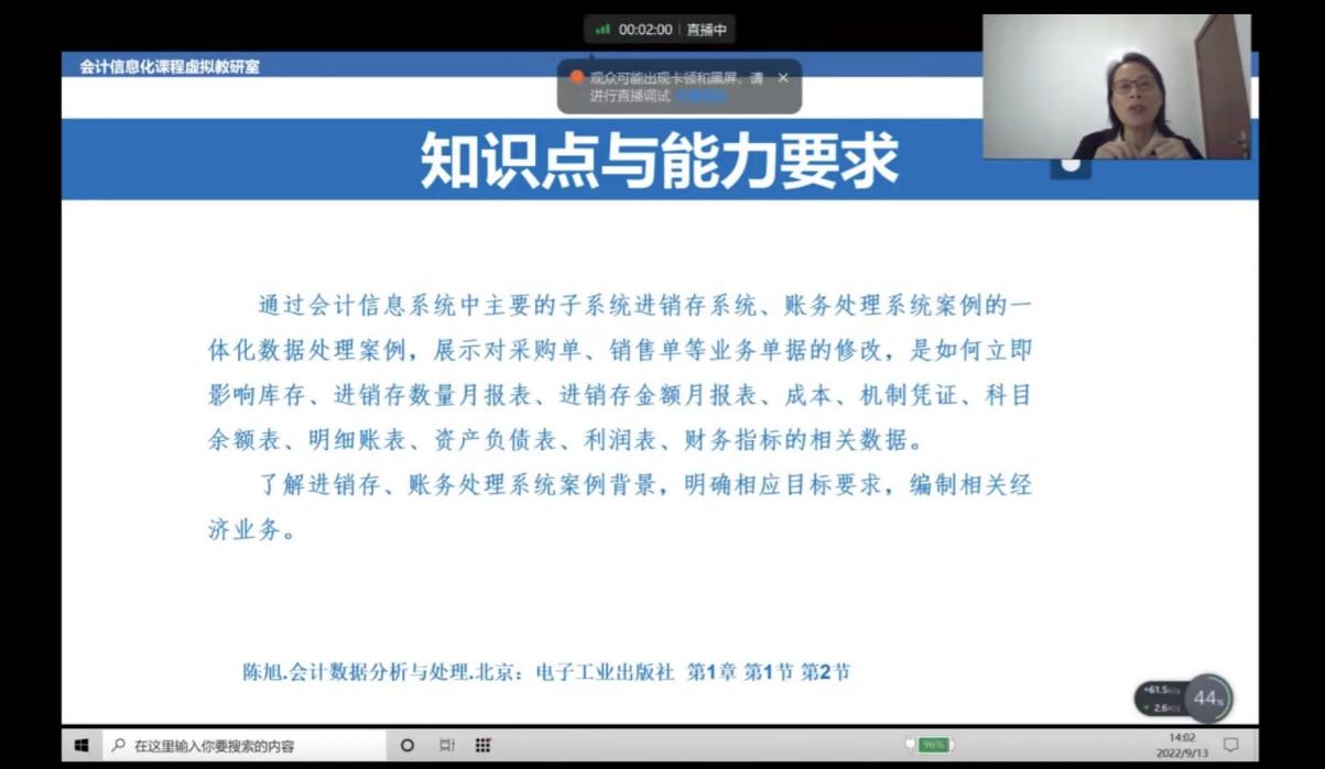 2022年9月13日下午,由教育部会计信息化课程虚拟教研室、重庆市成渝数智会计虚拟教研室、重庆市会计信息化教学名师工作室联合主办的智能会计教学工作坊(第十四期)在钉钉APP线上直播顺利举行。公司邀请到重庆理工大学陈旭教授为同学们讲授《会计业务数据分析》课程。bb贝博艾弗森官方网站王世杰老师和2022级会计专硕全体员工参加了此次教学工作坊。