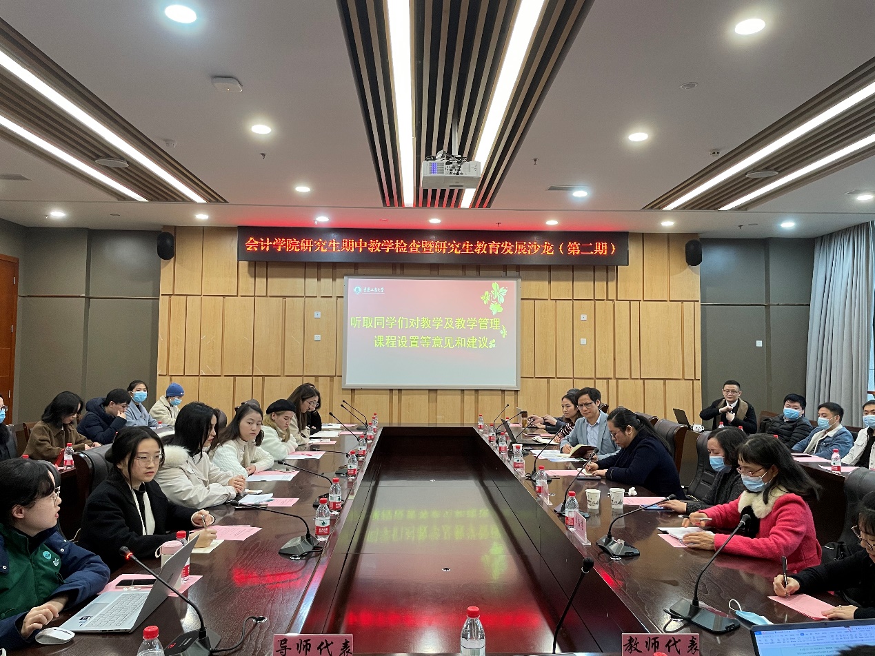 11月19日下午,bb贝博艾弗森官方网站研究生期中教学检查暨研究生教育发展沙龙(第二期)在图书馆第五会议室召开。委书记罗惠玉、副书记郝颖、副经理钟廷勇、研究生教指委主任程文莉出席了会议,审计专硕主任王杏芬、MPAcc教育中心主任陈欢、会计系主任蒋弘以及各教研室主任、学业导师代表、任课教师代表、研究生管理人员和各年级研究生代表参加了会议。会议由钟廷勇主持。