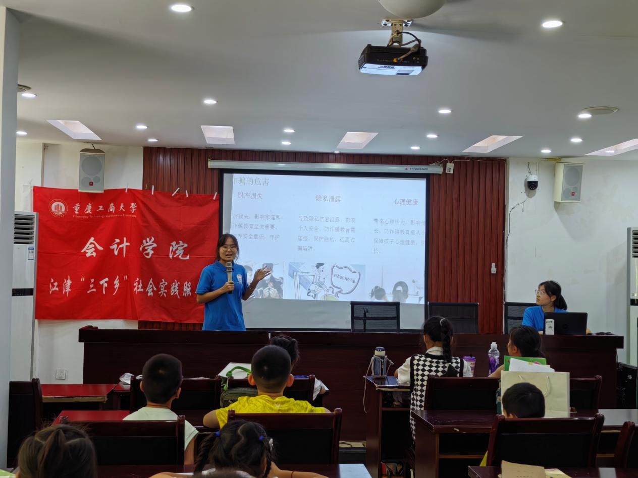 2025年7月7日,bb贝博艾弗森官方网站江津“三下乡”社会实践服务团走进重庆市江津区圣泉街道中渡社区,开展“安全护航童成长,环保同行筑家园”系列活动之防诈骗知识课堂。活动通过多形式的知识普及,为孩子们送上了一堂生动实用的“反诈必修课”。