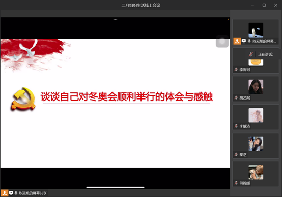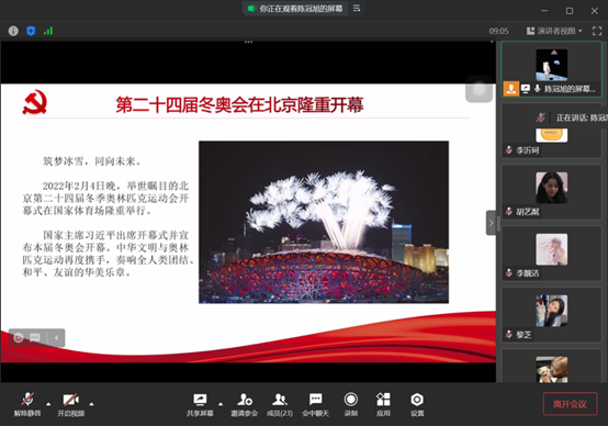 其次,陈冠旭同学带领党员同学回顾了在2月举办的第二十四届冬季奥林匹克运动会,并认真领会了习近平向国际奥委会第139次全会开幕式发表视频致辞的重要内容:从2008年的“同一个世界,同一个梦想”到2022年的“一起向未来”,中国积极参与奥林匹克运动,坚持不懈弘扬奥林匹克精神,是奥林匹克理想的坚定追求者、行动派。甘梓琪同学分享了自己对冬奥会顺利举行的体会与感触。冬奥会开幕式展示了博大精深的中国文化,令她感到骄傲与自豪。她还表示,拼搏与挑战的奥运精神将给她未来的学习与生活带来十分积极的影响。