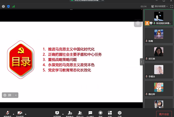 首先,陈冠旭同学带领全体成员认真学习了习近平在省部级主要领导干部学习贯彻党的十九届六中全会精神专题研讨班开班式上的重要讲话精神。分别从推进马克思主义中国化时代化、正确把握社会主要矛盾和中心任务、重视战略策略问题、永葆党的马克思主义政党本色、党史学习教育常态化长效化五个方面进行了学习。