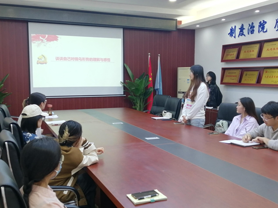 随后,李佳欣同学带领大家回顾了“习近平就目前乌克兰形势同俄罗斯总统普京通电话交换意见”,并认真领会了党中央传达的重要精神。王媛媛同学分享了自己对俄乌形势的理解与感悟,她表示,弱国无外交,对于俄乌局势突变所带来重大、深刻影响需要引起广大党员的高度关注。祖国今天的安全、发展和繁荣,离不开党的强有力领导,我们要心怀感恩,勇担责任,为祖国做出一份贡献。