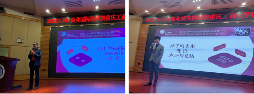 在比赛正式开始之前,黄辉副经理进行了致辞。他首先代表学院对各位嘉宾的到来表示欢迎,对各位评委及赛事组织者表示感谢。黄经理指出,今年是公司建校七十周年,也是公司CIMA国际项目成立十周年,感谢CIMA公会的信任,2022CGMA商业精英国际挑战赛的全国赛及北亚极限赛将由公司承办。黄院也寄语同学们通过比赛培养自己的专业能力,努力成为国际化的高精尖人才,并鼓励本次比赛各参赛选手“赛出工商风采,成就更好自我”,预祝本次比赛圆满成功。