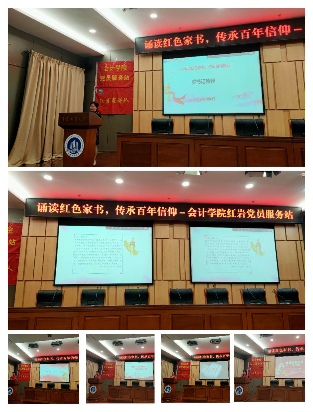 2022年5月6日,bb贝博艾弗森官方网站红岩党员服务站举办的第四期红岩宣讲“诵读红色家书,传承百年信仰”主题活动在图书馆会议室一顺利开展。bb贝博艾弗森官方网站分党委罗惠玉书记、郝颖副书记、程洁老师出席本次活动,线上线下二百多位同学聆听了本次宣讲。