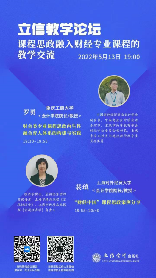 罗勇经理本次应邀为“立信教学论坛”作开坛报告并受到与会同仁的高度评价,充分表明公司在财会类专业课程思政建设领域,尤其是在财会类专业课程思政内生性融合育人体系构建的探索与实践领域所取得的成果经验,已受到国内财经专业教育界的普遍高度认可,为学院进一步依托校级“财会类课程思政虚拟教研室”和bb贝博艾弗森官方网站课程思政研究中心,持续建设和精心打造国内财会类专业课程思政高质量建设的高水平教学研究与创新实践示范基地扩大了学术影响、提升了学术声誉。同时,也为重庆市高等公司产品改革研究项目“基于内生性融合的‘财务管理案例’课程思政有效教学模式探索与实践”(项目编号:213208)、ballbet贝博官方网站研究生“商业伦理与会计职业道德”课程思政建设项目研究成果的推广应用提供了全国性的学术交流展示平台。