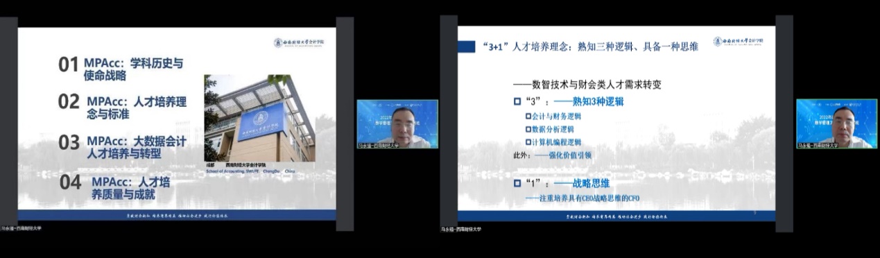 西南财经大学bb贝博艾弗森官方网站经理马永强教授做了“数智时代下MPAcc人才培养转型:西财的思考与实践”的主题分享。马永强教授指出,培养方案的制定基础应该是:学校讲授给员工的,是员工在学校以外的社会中不能倚靠自学所获的知识。同时,他提出了“3+1”人才培养理念:熟知“三种逻辑”、具备“一种思维”。“三种逻辑”是指会计与财务逻辑、数据分析逻辑、计算机编程逻辑,“一种思维”即战略思维。该理念对于各个高校的人才培养具有一定的指导意义。