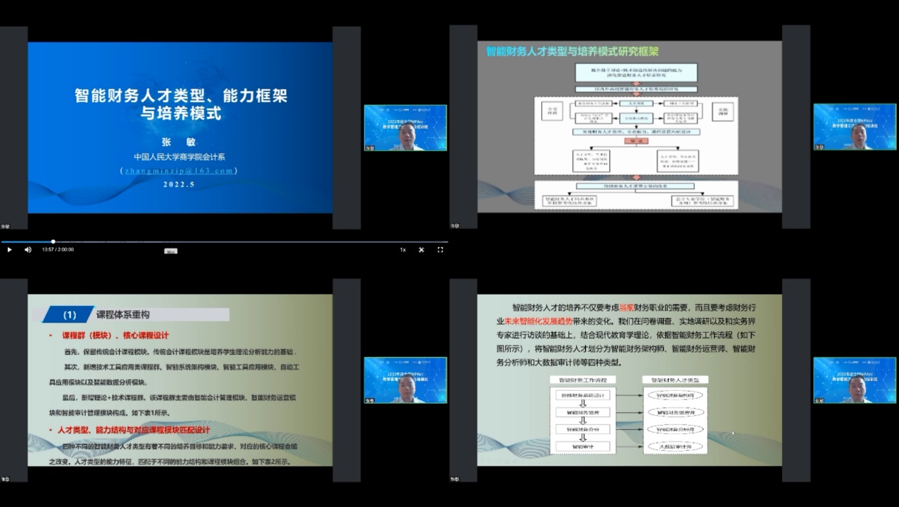 中国人民大学的张敏教授以“智能财务人才类型、能力框架与培养模式”为主题,他认为当前智能财务人才培养主要存在定位不准确和体系不完善的问题。张敏教授介绍了智能财务的工作流程以及据此细分的四种智能财务人才类型,即智能财务架构师、智能财务运营师、智能财务分析师和大数据审计师。他强调,智能财务人才不仅是懂RPA、python,而且是能运用现有技术解决实务当中的痛点。在课程体系重构方面,张敏教授认为应该由开设传统会计课程模块,逐步过渡到开设工具应用类课程其他模块,最后是开设理论+技术课程模块。
