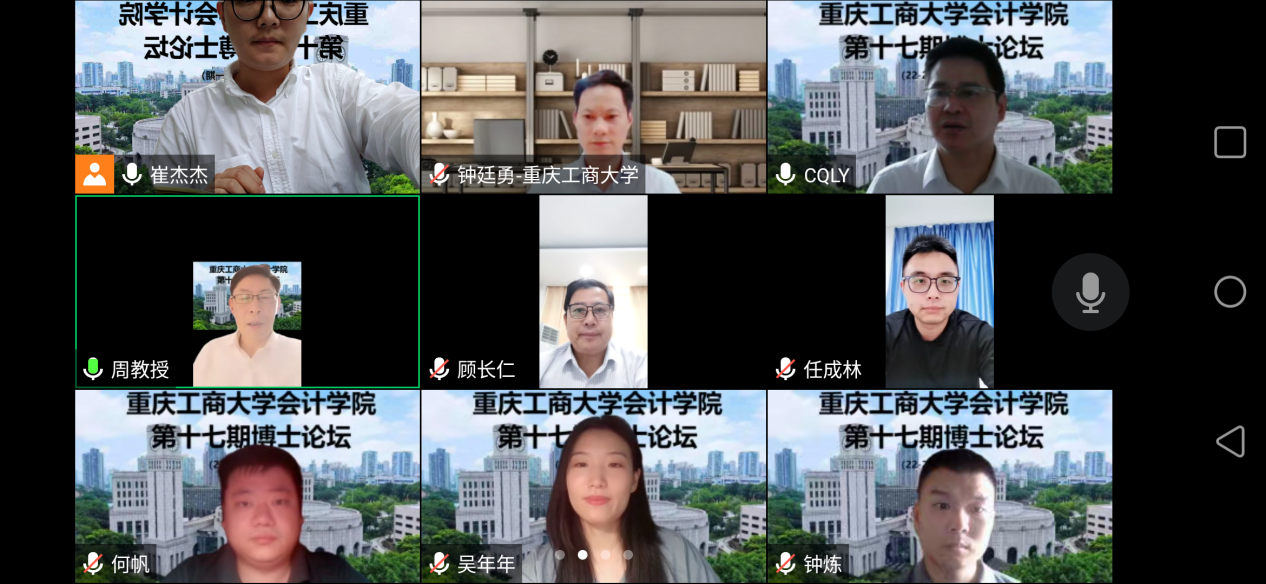 2022年9月16日下午,bb贝博艾弗森官方网站第十七期博士论坛通过线上会议成功举行。本次论坛邀请到了工商管理硕士,正高级工程师,正高级会计师,美国注册管理会计(CMA)顾长仁;经济学博士、会计学博士后,武汉大学二级教授、珞珈特聘教授,武汉大学会计学科负责人,博士研究生导师王永海两位专家进行线上交流,二十余名bb贝博艾弗森官方网站的教授、博士和研究生出席了本次论坛。