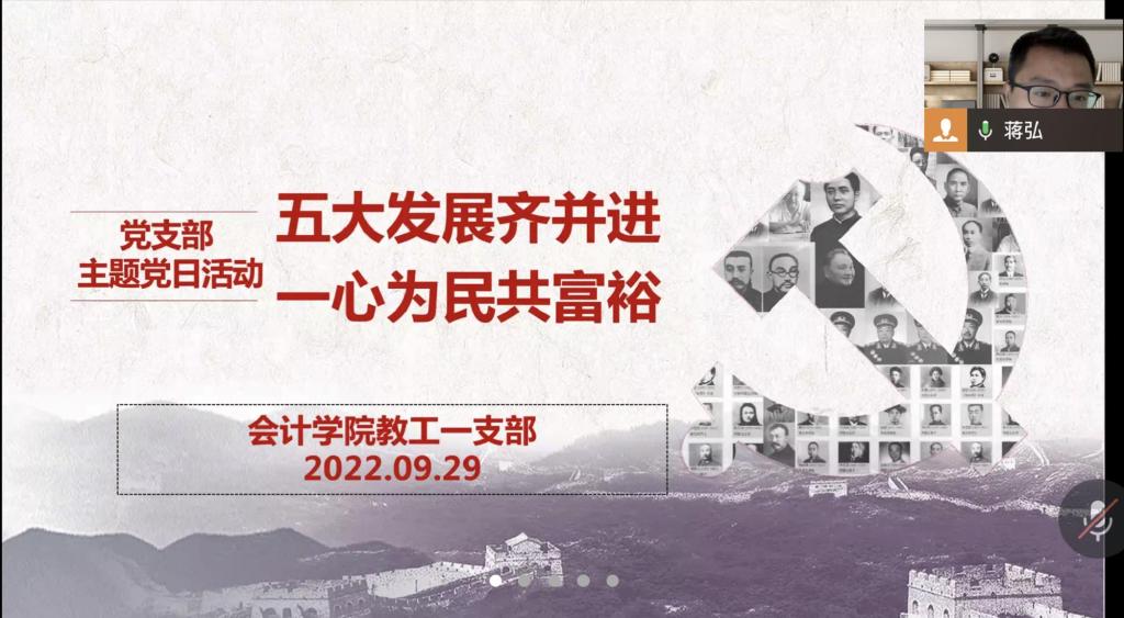 2022年9月29日,bb贝博艾弗森官方网站教工一支部通过企业微信召开了题为“五大发展齐并进,一心为民共富裕”的主题党日活动。活动由教工一支部书记蒋弘主持,一支部全体党员参加了会议。