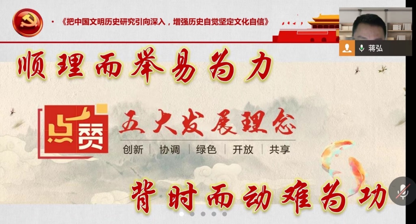 活动一开始,蒋弘领学了习近平总书记的重要文章《全党必须完整、准确、全面贯彻新发展理念》。新发展理念最早是在2015年10月的中共十八届五中全会时提出的。作为一个系统的理论体系,该理念回答了关于发展的目的、动力、方式、路径等一系列理论和实践问题,阐明了我们党关于发展的政治立场、价值导向、发展模式、发展道路等重大政治问题。蒋弘首先通过列举相关数据和信息的方式,从宏观上系统总结了我国至今在创新、协调、绿色、开放、共享发展上取得的辉煌成就。然后,以比亚迪公司的发展史为例,从微观上分析了新发展理念的实践活动。比亚迪专注技术、潜心研发体现了创新发展,产业布局、多点开花体现了协调发展,投资清洁能源、停售燃油车体现了绿色发展,应用现有科研成果、广纳世界贤才体现了开放发展,将刀片电池提供给其他人从而促进行业进步体现了共享发展。可以说,新发展理念是从小到企业、大到国家的长期实践所积累的经验和教训当中提炼出来,它指明了我们在走中国特色社会主义道路时要重点关注的内容,是对一个国家和社会现在及未来能够保持高质量、可持续发展的规律性总结。所谓,顺理而举易为力,背时而动难为功。全国人民在中国共产党的领导下,将新发展理念贯彻到经济社会发展的全过程和各领域,做到五大发展齐头并进,中国特色社会主义建设就会稳定甚至加速推进,人民的生活就会变得更加富裕和幸福。中国将在国家和社会治理上给我们这个并不平静的地球村树立起一个良好的典范,让“世界看亚洲,亚洲看中国”成为更多人的共识。