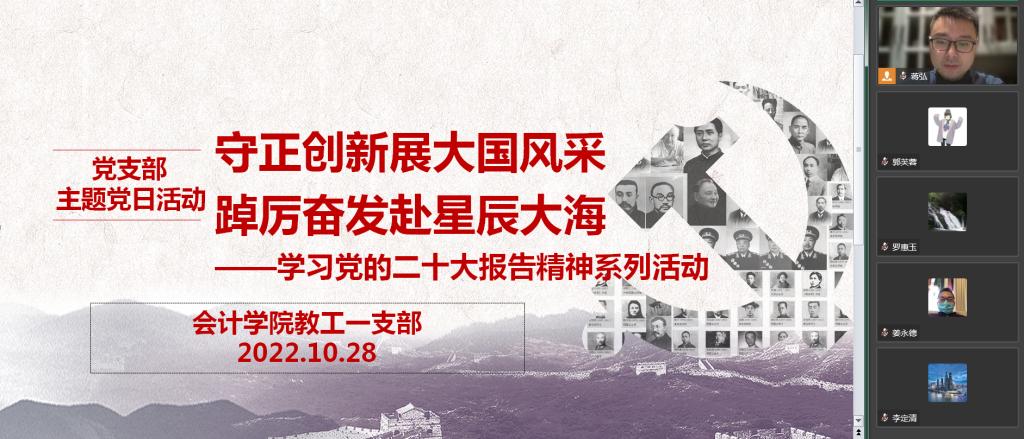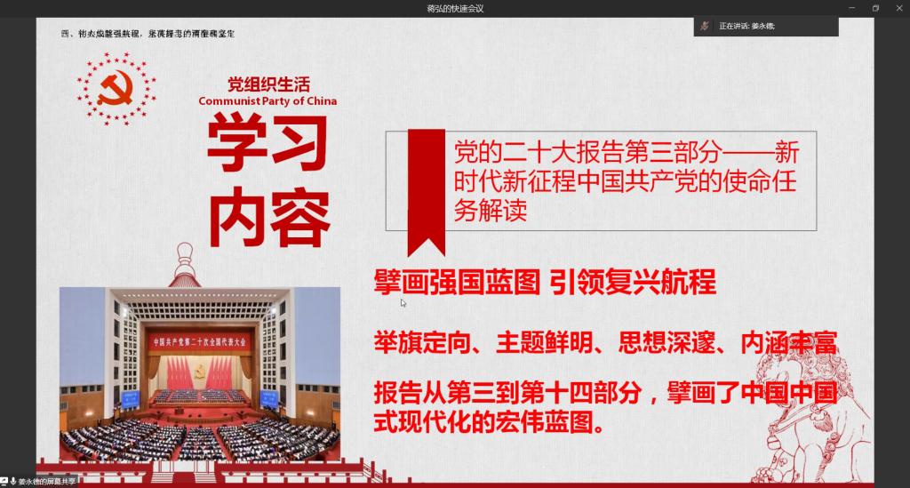 为认真学习、深刻领会、全面贯彻党的二十大报告精神,从2022年10月28日起,bb贝博艾弗森官方网站教工一支部开启了主题名为“守正创新展大国风采,踔厉奋发赴星辰大海”学习党的二十大报告精神系列活动。10月28日是该系列活动的第一次,活动由教工一支部书记蒋弘主持,一支部全体党员参加。