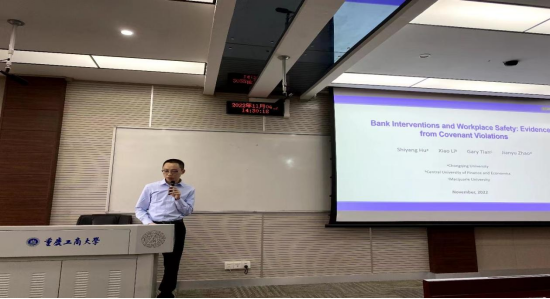 沙龙第一阶段是主题报告环节。胡诗阳博士以《Bank interventions and Workplace Safety:Evidence from Covenant Violations》为主题,围绕银行干预与工作场所安全等内容,为大家详细介绍了相关理论与实证知识,尤其强调文章选题应当把握问题导向、结合自身专长、富有新意。特邀专家的报告具有较强的前观性,为学院研究生今后学术论文的写作指明了方向。