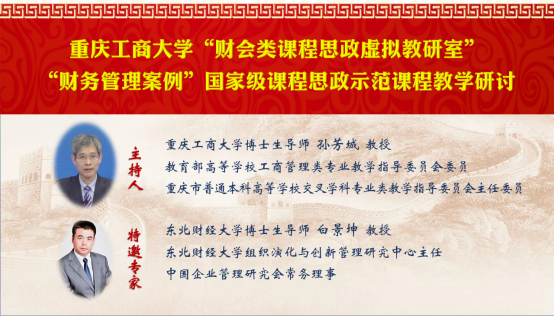 2023年6月30日上午,由公司国家级课程思政示范课程“财务管理案例”教学团队、“财会类课程思政虚拟教研室”以及重庆市高校黄大年式教师团队“ballbet贝博官方网站会计专业教师团队”联合举办的“财务管理案例”国家级课程思政示范课程交流互动教学研讨活动通过腾讯会议成功举办。