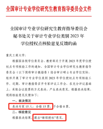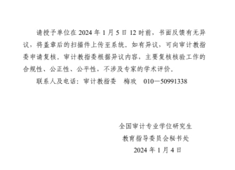 2024年1月4日,审计教指委专家评议结果显示:公司审计专硕全票通过2023年审计专业学位授权点专项核验工作,获得“继续授权”意见。