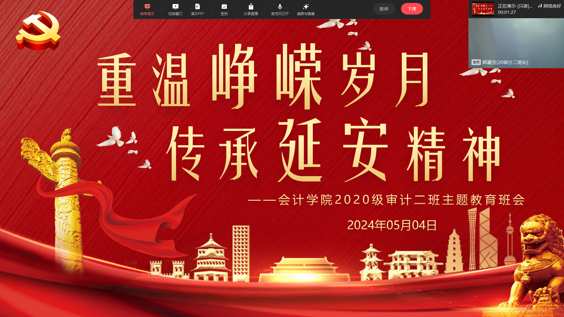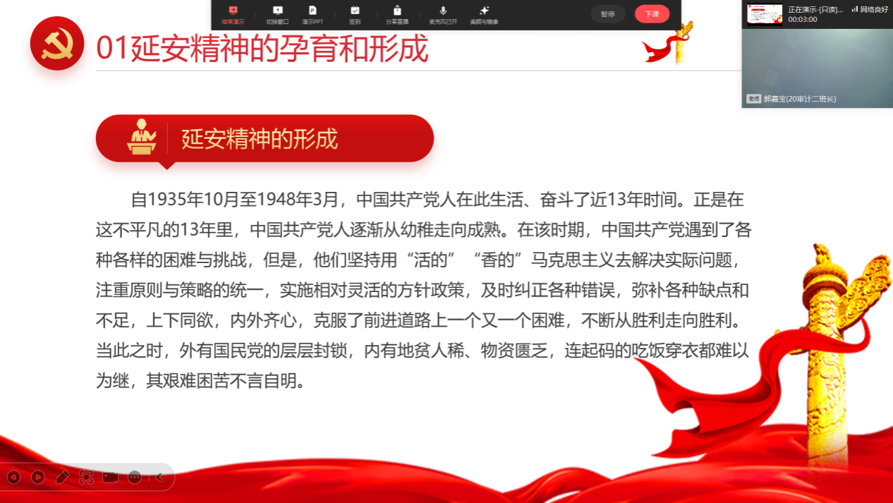 2024年5月4日,bb贝博艾弗森官方网站延安精神班2020级审计二班全体员工借助线上平台,成功举办了“重温峥嵘岁月,传承延安精神”五四青年节主题活动。此次活动旨在通过线上交流的形式,让同学们跨越时空的限制,共同回顾革命历史,传承和弘扬延安精神。