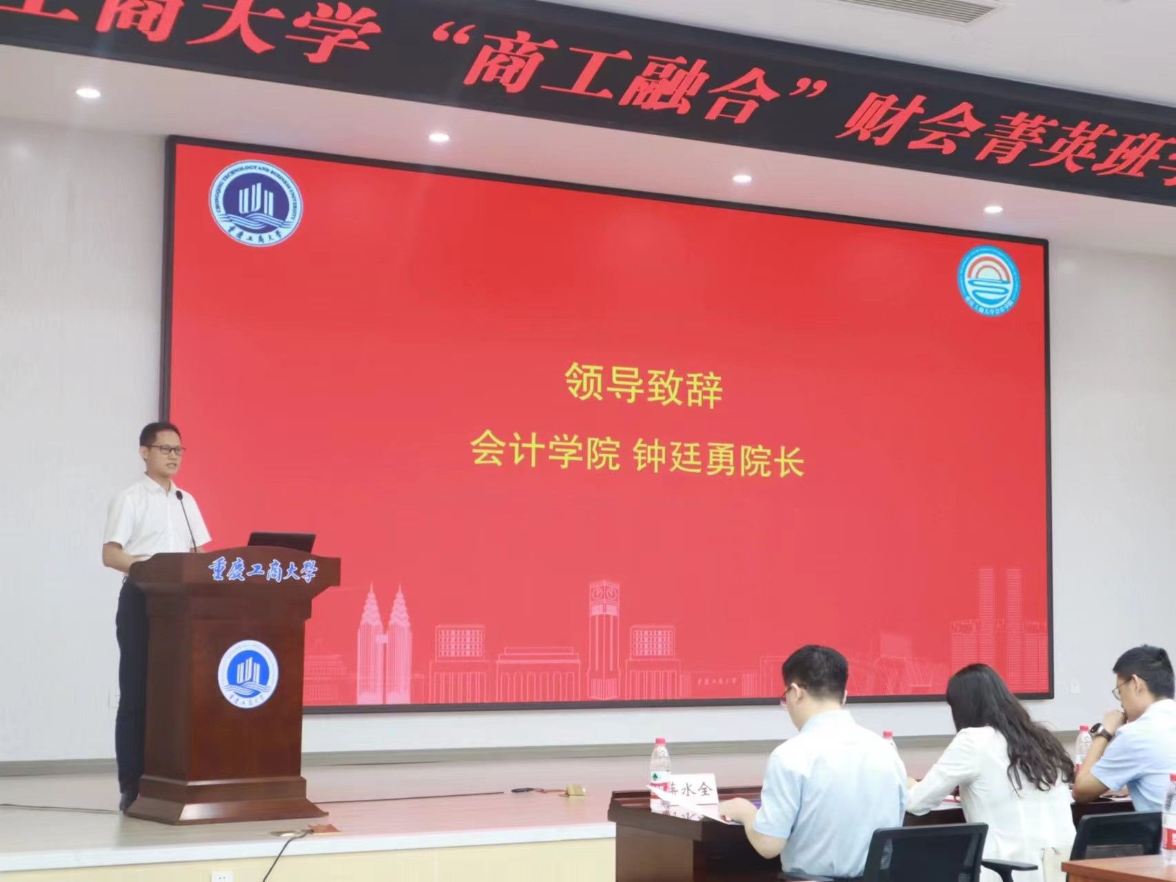 bb贝博艾弗森官方网站经理钟廷勇致辞。他指出bb贝博艾弗森官方网站响应国家和区域人才需求,落实学校“商工融合”人才培养改革,依托数字财务现代产业学院,开设“商工融合”财会菁英班,旨在培养财会专业基础扎实、管理能力卓越、兼具产业发展洞察的创新型、应用型、复合型、国际化、数字化的数智财会菁英。希望同学们以“三志、三心、三力”为引领,奋发图强、再创佳绩。希望合作企业和事业导师献计献策,支持学院开创人才培养新局面。