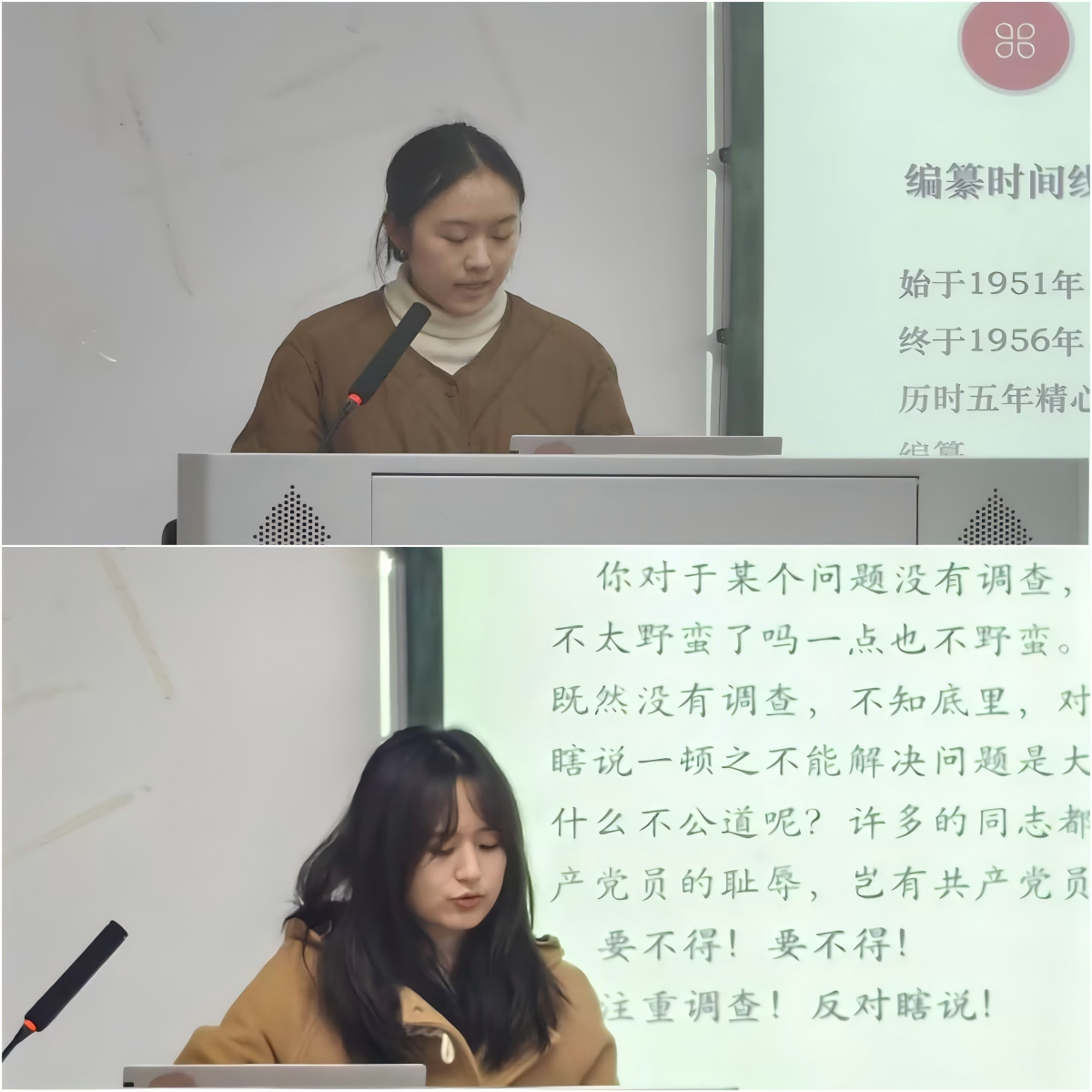 活动正式开始后,五位同学依次上台分享了他们的阅读感悟。来自22级审计硕士班的梁文梦同学、24级审计硕士班的唐曌同学,分别从阅读方法、阅读启发等方面分享了他们对于《毛泽东选集》的阅读心得,她们指出《毛泽东选集》不仅是一部历史文献,更是中国革命和建设时期的重要指导思想,凝聚了毛泽东同志对中国社会深刻洞察与科学分析的智慧结晶,并引用毛主席“你要知道梨子的滋味,你就得变革梨子,亲口吃一吃”这句话来鼓励各位同学自己去寻找书中的答案。