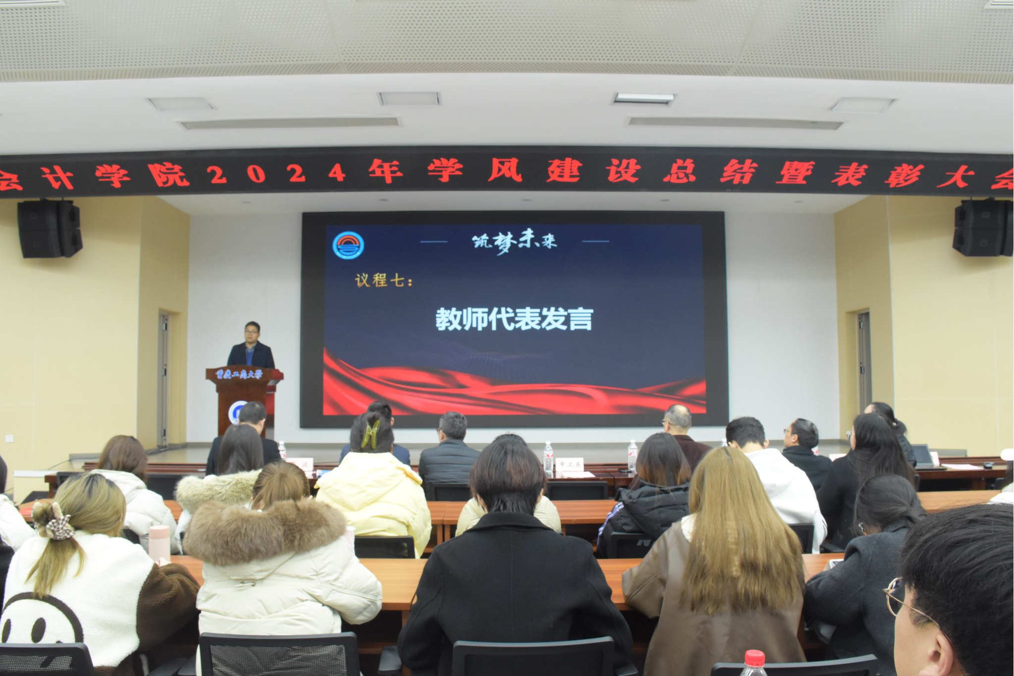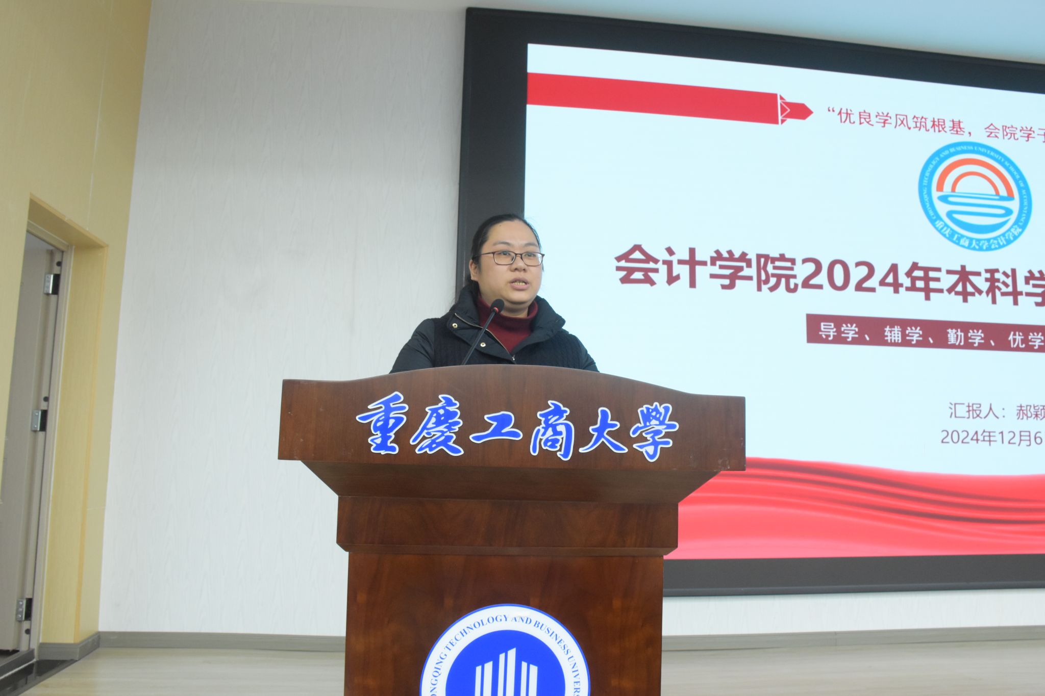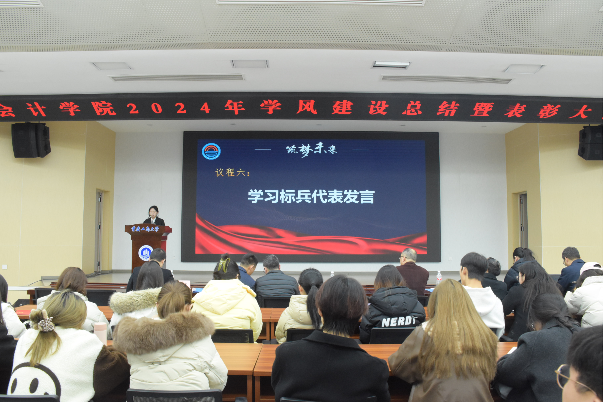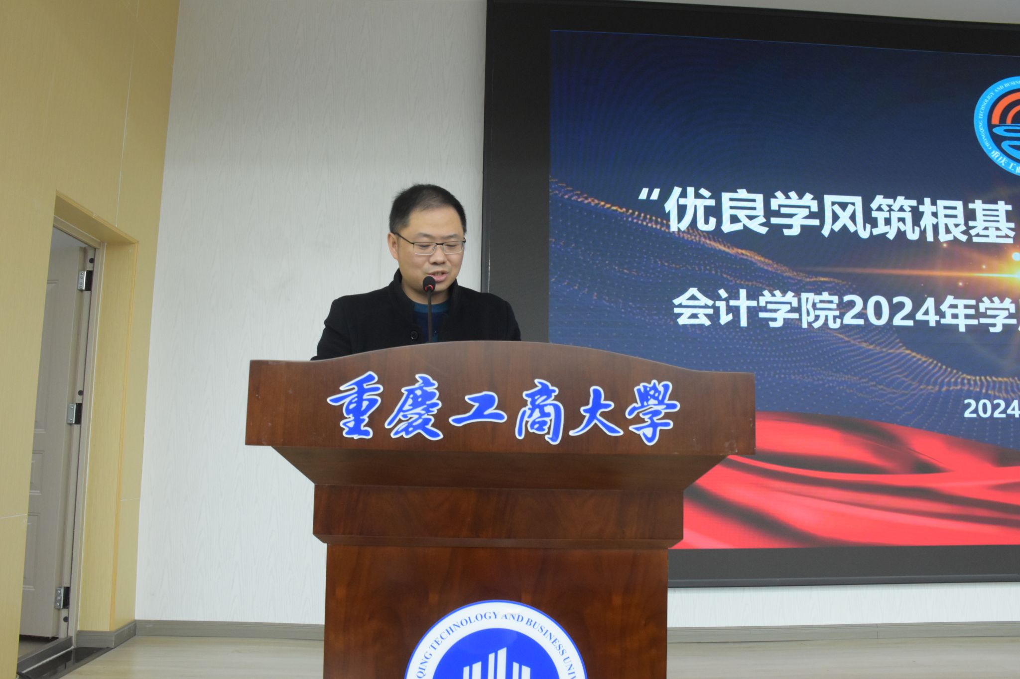大会伊始,郝颖副书记对学院2024年学风建设工作做总结,她指出:学院秉承“勤学善思、求真笃行”的学风和“诚信精业、含弘自强”的院训,结合专业特点和员工实际,持续优化“导学、辅学、勤学、优学、督学、励学”六位一体学风建设体系,着力培养学院优良学风,形成了以活动促学风、以服务护学风、以榜样树学风、以实践创学风、以管理强学风、以环境育学风的学风建设工作新格局,全力培养德智体美劳全面发展的卓越创新会计人才。同时,她还从创设“导学—引领”体系、搭建“辅学—帮扶”体系、培育“勤学—示范”体系、打造“优学—实践”体系、构建“督学—养成”体系、布局“励学—激发”体系做了学院2024年学风建设的工作总结,并对学院未来学风建设工作做出展望。
