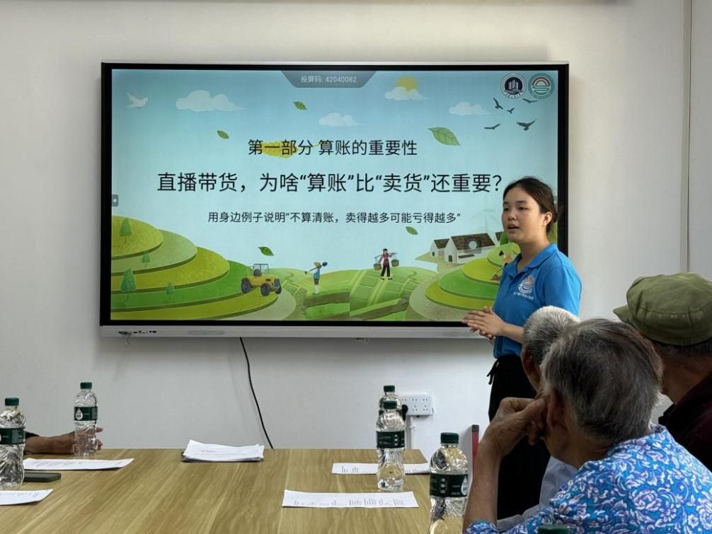 7 月 14 日上午,实践团初入红岩村,团队成员为新农人开展了直播算账培训,内容涵盖算账的重要性、成本计算与定价、合同注意事项以及记账与提高收益四个方面。培训采用案例教学方式,志愿者将难懂的专业术语与日常例子相结合,帮助农民理解、掌握并运用相关知识,让新农人了解算账与记账,懂得如何合理定价以及防范风险,切实提升其财务管理能力,助力农货通过直播电商渠道走向更广阔的市场。