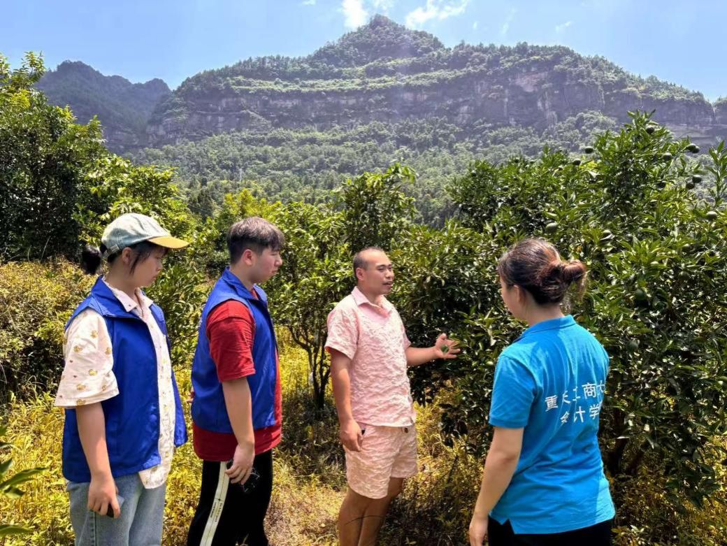 7月14日下午,团队前往农户种植基地进行实地走访,依次参观了桑叶园和橘园,详细了解农户的生产情况、经营情况。农户介绍,每棵橘树都要进行疏果,只保留约 100 个果子,这样才能保证橘子口感甘甜、大小均匀。这次走访也让团队对农产品从种植到销售的完整产业链有了更直观的认识。