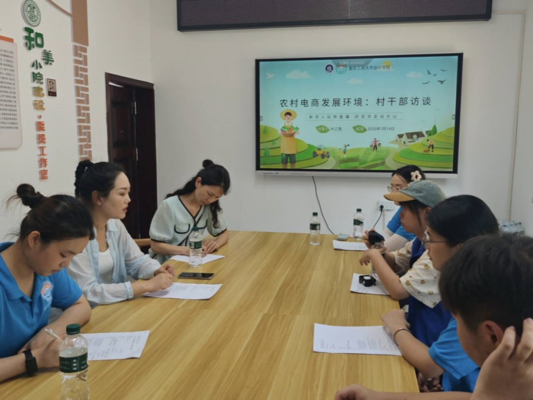 7 月 14 日中午,在红岩村村委会,团队与当地村委吴书记的一席谈话揭开了此次活动的序幕。红岩村的直播始于几年前:当时青脆李丰收过剩,又遭遇暴风雨威胁,红岩村在与时间赛跑,村干部当机立断,开启直播卖货。这个决定让红岩村的农产品从此不愁销路。据了解,去年该村通过电商直播实现利润约8万元,全部存入村集体账户,公开透明,但在成本核算等方面仍存在困惑。访谈结束后,团队成员还与其他村干部进行了问卷调查和采访,进一步摸清了当地电商发展的实际情况。