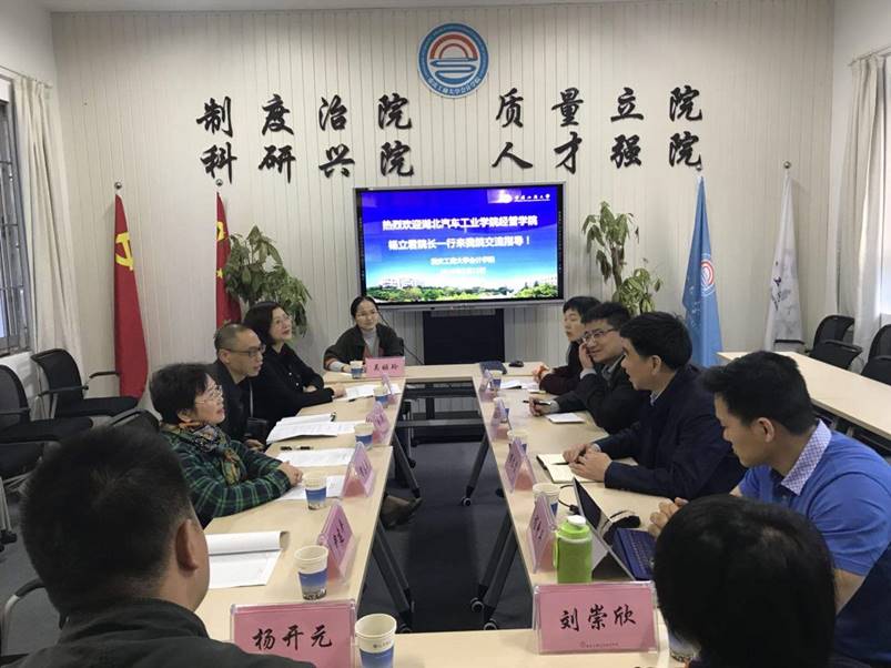 2018年3月15日上午,湖北汽车工业学院经济管理学院杨立君经理、周明智主任、程曾平副主任、刘崇欣教授和於流芳博士来学院进行调研交流,罗惠玉书记、尹建平副书记、黄辉副经理、杜迎新主任、吴娅玲博士、杨开元博士、韩超博士和李传彪老师参加了交流会。
