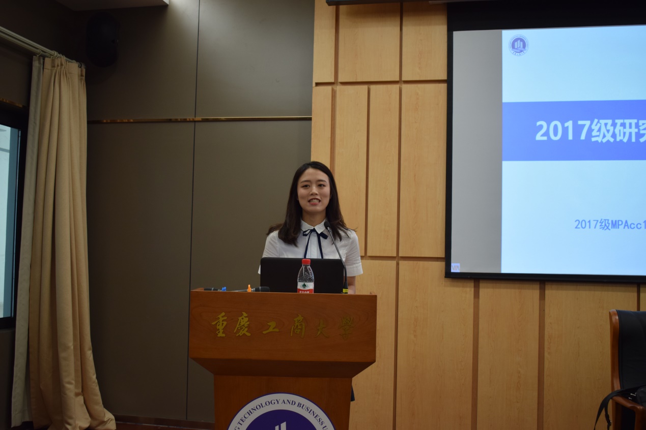 接下来,2017级员工代表陈贝同学则给初来乍到的新生们分享了这一年来的研究生生活和感悟,期盼学弟学妹们能有计划、强执行、平心态、善沟通,要勇于探索、敢于创新。