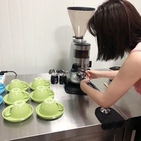 第三,咖啡制作实训。在等待面包在烤箱中完成“变身”的间隙中,同学们开始学习如何制作咖啡。依然是老师先向同学们演示同时讲解,待老师讲解结束后,同学们纷纷开始动手制作属于自己的那杯咖啡。同学们刚开始尝试的时候对一些细节和用量还是不太熟悉,在某个节点卡住的时候老师就会耐心地指导每个同学并再次讲解。随着对操作流程的熟悉,同学们开始自由发挥,DIY属于自己咖啡的独特拉花,十分开心!