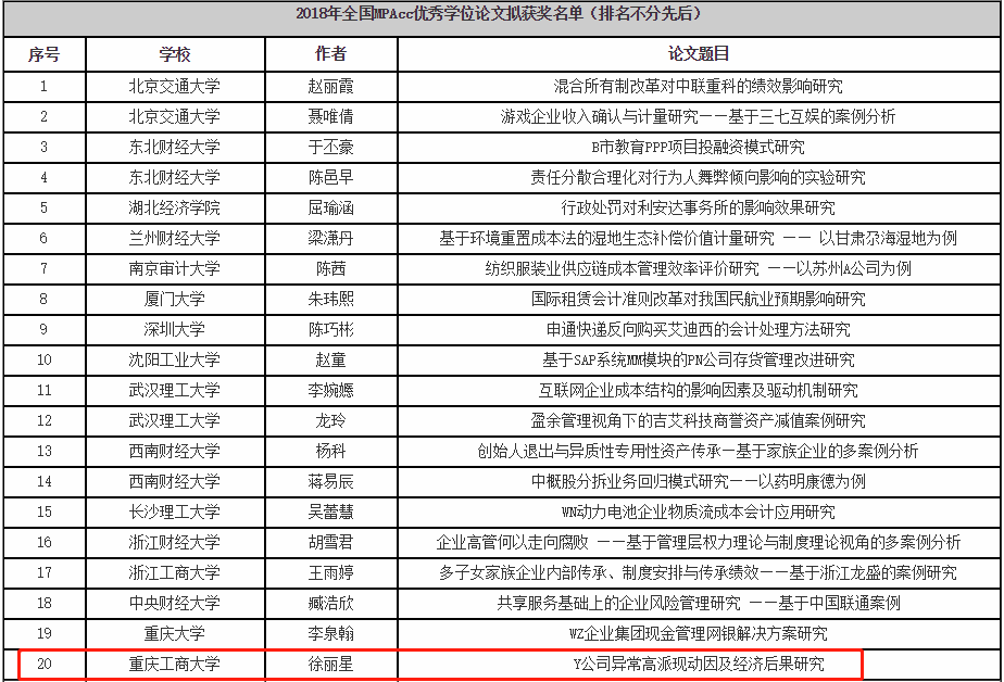 6月28日,在刚刚结束的2018年全国MPAcc优秀学位论文奖、优秀学位论文组织奖评选中,由学业导师黄辉教授、事业导师赵兴明先生共同指导的公司2016级MPAcc2班徐丽星同学的参选论文《Y公司异常高派现动因及经济后果研究》从全国180多所院校的参评论文中脱颖而出,获评“2018年全国MPAcc优秀学位论文奖”。