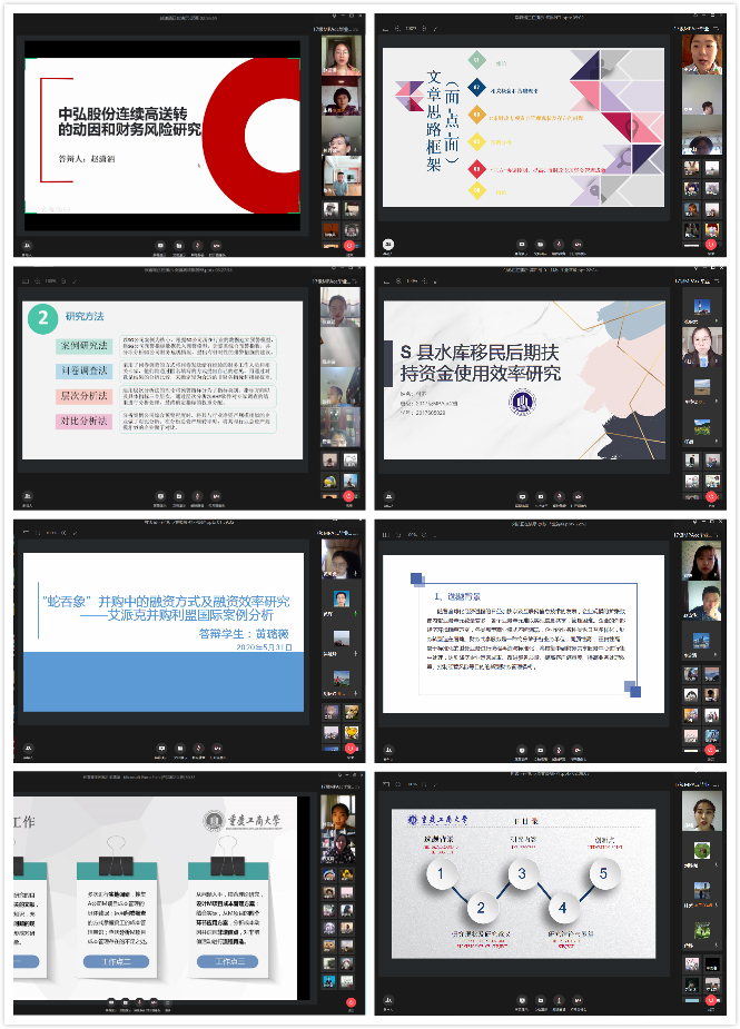 首先,宣布答辩规则。由答辩组长报告答辩委员会组成、答辩人情况、宣读答辩规则并宣布答辩开始;随后,员工陈述论文。同学们答辩准备认真充分,答辩PPT制作精美用心,在答辩过程中论述清晰、流畅。同学们的论文紧跟会计研究前沿热点,包括自然资产离任审计、财务共享、股权质押、环境审计、高送转、业绩承诺、内部控制、供应链金融、并购管理等方面;第三,答辩委员提问。答辩专家秉承严谨细致、认真负责的学术态度,认真倾听同时做好记录,在答辩人报告完毕后提出问题,并从论文的规范性、逻辑性、文献综述、论文边际贡献、案例研究方法、论文严谨性和创新性提出修改意见。答辩委员们所提出的问题发人深省,修改意见对于同学们的论文来说均是点睛之笔;第四,专家评分。所有同学陈述及回答完毕后退出会议室,答辩委员会委员对答辩过程与结果进行评议并进行线上评分;最后,答辩总结。各答辩人和观摩者重新进入会议室,由答辩组长对答辩情况进行总结并宣布答辩结束。在2天中,整场远程视频答辩在紧张严肃的氛围下圆满结束。