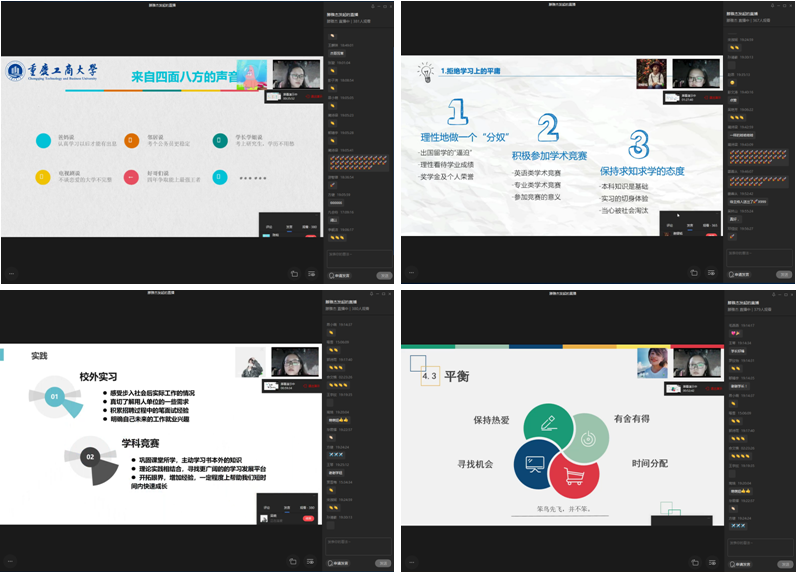 随后,五位优秀毕业生分别将自己的经验与建议进行了分享和展示。16级审计学专业的陈灿结合自身经历,对大学四年的每个阶段都给予了相应的建议并详细的给学弟学妹们讲解了考研期间的备考秘诀;来自16级会计学班的龚春萌与同学们分享了自己大学四年里的目标与遗憾,希望学弟学妹们以此得到激励,树立目标;来自16级ACCA专业的吴晓从学习、竞赛和社会实践的方面,分享了她如何取得成功,并在各项比赛中脱颖而出的成功经验;来自16资产评估专业的曹凤鹭总结分享了自己老员工活中的三段难忘经历,希望学弟学妹们从中吸取教训并珍惜四年老员工活的美好回忆;来自16级财务管理专业的谢熠韬分享了在学习和生活上都要拒绝平庸,不断鞭策自己,毕业时定会取得耀人的成绩。