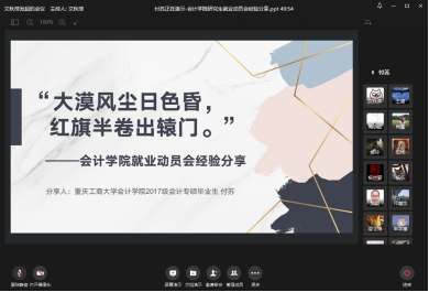 习近平总书记指出,“就业是最大的民心工程、民生工程、根基工程,必须抓紧抓实抓好”。为了进一步落实习近平的讲话精神,2020年9月11日下午,bb贝博艾弗森官方网站启动了2021届研究生就业动员大会。bb贝博艾弗森官方网站分党委书记罗惠玉、副书记郝颖、副经理钟廷勇、辅导员文秋萍、2017级员工付苏以及2021届全体研究生参加了本次会议。会议由文秋萍主持。