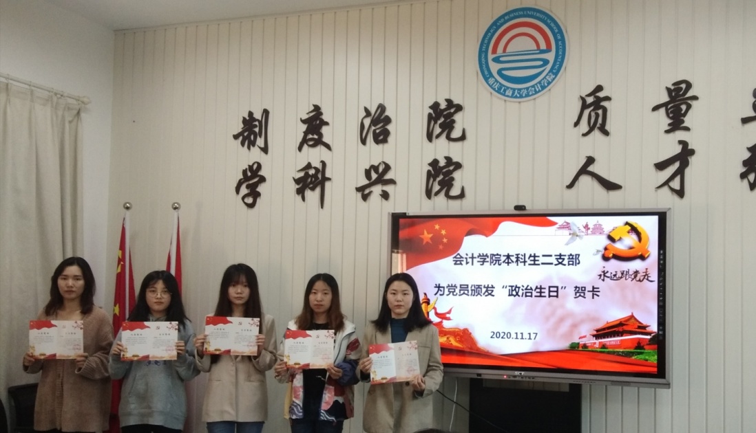 最后,全体党员为11月入党的吴凡、陈柯旨、李苡嘉、刘梦诗、杨姝笛5位同志过政治生日,支部书记付海南为她们颁发了党员政治生日贺卡。该贺卡不仅承载着党组织诚挚的祝福,也满怀党组织对党员的希望和鞭策。