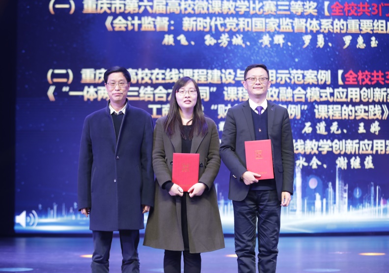 随后,公司党委李志雄书记向王婷老师颁发了全国辅导员年度人物的奖牌,公司党委宋豫副书记向获评“会计之星”的同学们颁发了奖状和奖杯,陈兴述副董事长向顾飞老师和蒋秋菊老师颁发了重庆市第六届高校微课教学比赛三等奖 ,相关职能部门领导为校级以上获奖的教师颁发奖状。