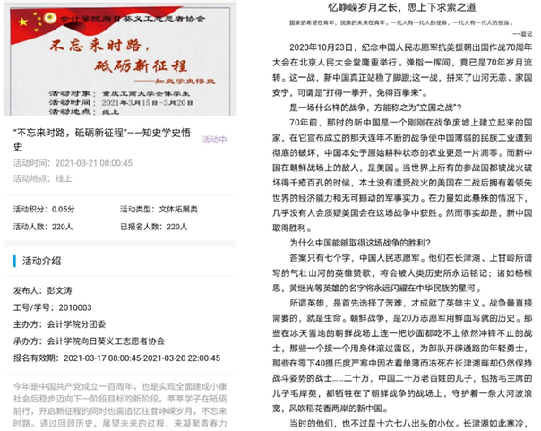 3月15日,征文比赛如期开展,同学们参与热情高涨。截止22日,共收到112份征稿。参赛作品首先由会计义协成员组成的评审团进行初评,再由学院老师复评,最终遴选出12份优秀作品。本次活动采用线上征集征文的形式引导在校员工学习四史,模式新颖,能够激发参与者的兴趣。值得一提的是,部分作品从专业角度进行分析,更加深刻地描写了在党的领导下人民社会生活发生的巨大变化。从无数历史大事件和人物事迹中,我们明白了“是历史和人民选择了中国共产党,只有中国共产党才能救中国,只有中国共产党才能发展中国”。