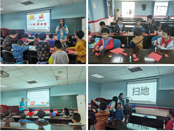 上午11:00,游戏环节开始。九名小朋友分为三组,以你划我猜的方式进行。小朋友以肢体语言进行表达,同伴对内容进行猜测,猜测正确者即积一分,凭积分高低决出获胜队伍。游戏内容既结合了劳动,又联系了生活,有效提高了其参与积极性及团队协作意识。随后,志愿者带领小朋友制作“五一劳动光荣勋章”,利用相关工具进行自主设计、制作勋章。此环节让小朋友亲自参与劳动创作,具有良好的教育意义。上午12:00,活动接近了尾声,志愿者与小朋友合影留念后,本次活动正式落下帷幕。