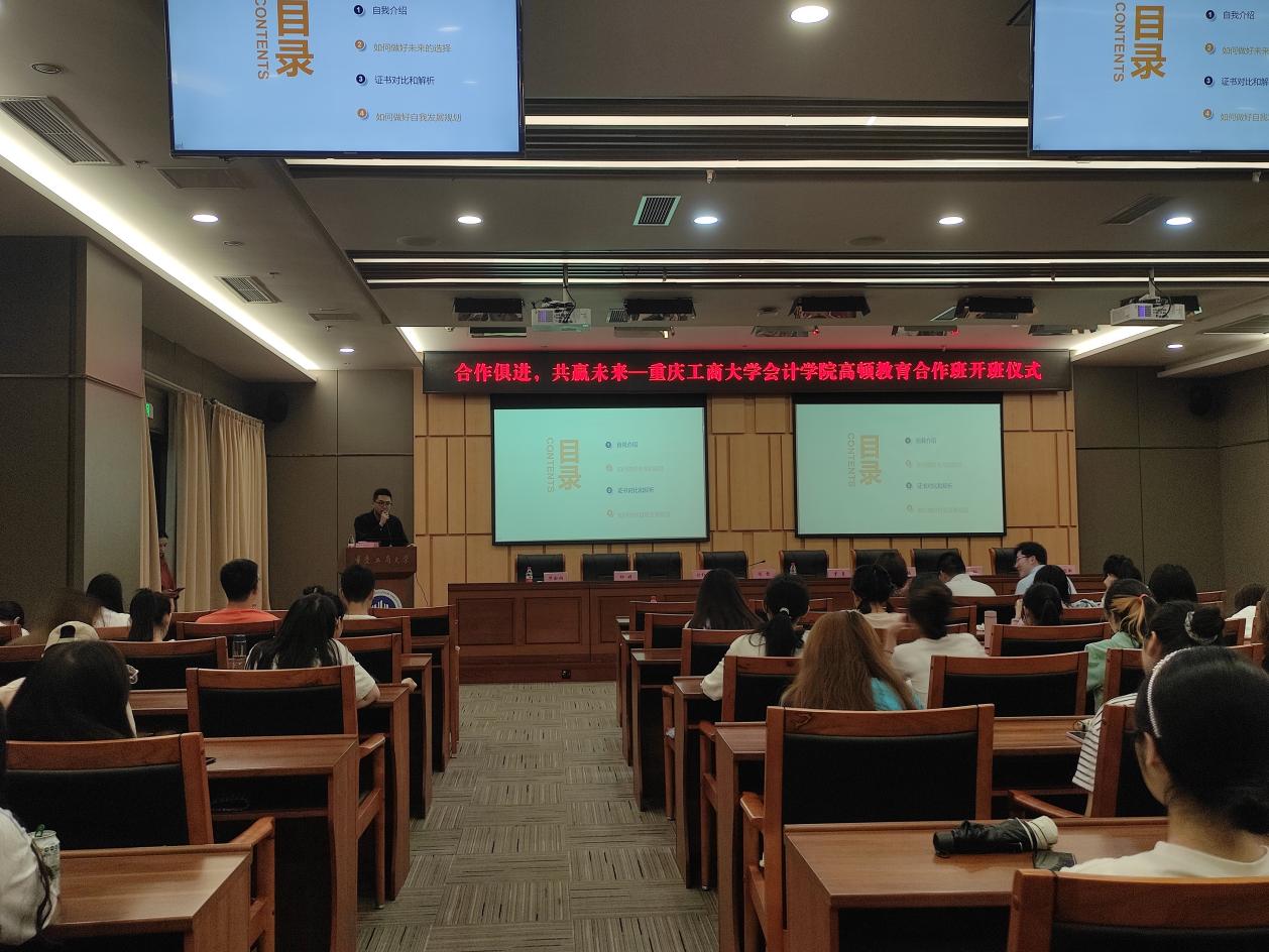罗勇经理、刘红飞董事长、陈哲先生分别就bb贝博艾弗森官方网站、高顿教育、国信证券的发展情况进行了介绍,并阐述了企业冠名合作班对学院、企业、员工的重要意义。刘红飞董事长、陈哲先生还对两家企业给冠名合作班同学提供的服务和支持内容进行了介绍,并对合作班同学提出了殷切希望。高顿教育重庆ACCA项目负责人毕企潮先生给同学们作了“会计学子的财经发展之路”的讲座。冠名合作班许颖琪同学作为员工代表发言,她对学院和高顿教育给予同学们的机会进行了感谢,并表示同学们一定会勤奋学习、积极实践、服务社会、报效国家,不负学院、企业、社会的期望。