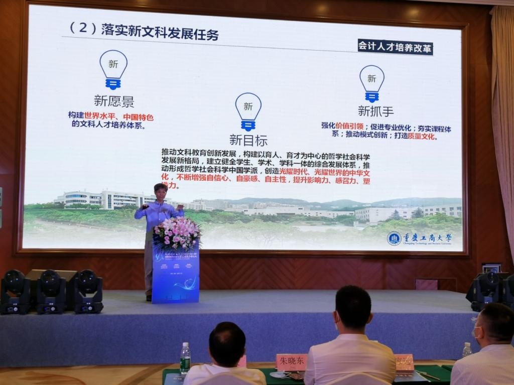 下午,委副书记、经理罗勇教授以“新文科背景下高校会计人才培养改革的思考”为题作了会计教育分论坛开坛报告。罗勇经理基于新技术、新经济,新时代、新使命,新阶段、新格局三大维度解构了新文科建设对高校会计人才培养提出的新要求,从塑造新目标、打造新专业、开发新课程、构建新模式、建设新文化五方面结构化地勾勒了其改革路径,并就如何处理好守正与创新、会计与科技、个性与共性三大关系作了深刻的阐述,引发了与会者的深度共鸣。