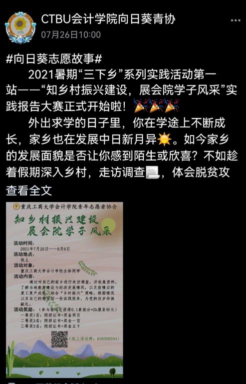 为贯彻习近平主席对乡村振兴讲话:脱贫摘帽不是终点,而是新生活、新奋斗的起点,同时让同学们体会脱贫攻坚落到实处给家乡带来的变迁,领略乡村振兴独特的一面。bb贝博艾弗森官方网站向日葵青年志愿者协会于2021年7月25日至8月10日在线上成功举办了以“知乡村振兴建设,展会院学子风采”为主题的实践报告大赛。