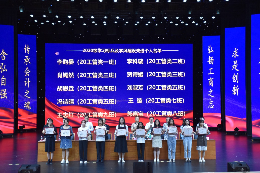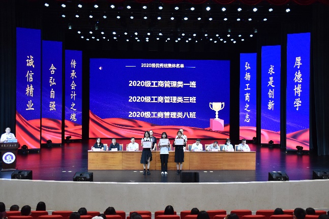 专职组织员石世明宣读《关于表彰2020-2021学年2020级工商管理类专业3个学风建设优秀班集体的决定》并进行颁奖,周兵副经理宣读《关于表彰2020级工商管理类专业学习标兵和学风建设先进个人的决定》并进行颁奖。