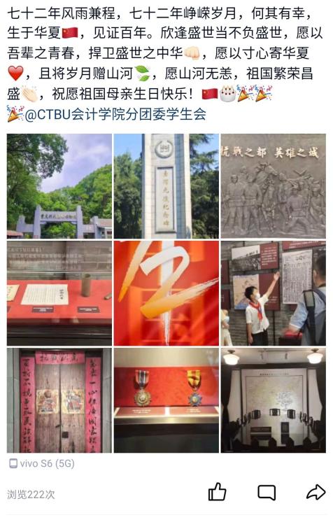 为庆祝中华人民共和国成立七十二周年,激发全院同学的爱国热情,弘扬爱国主义精神,增强时代使命,2021年10月1日,bb贝博艾弗森官方网站分团委员工会、bb贝博艾弗森官方网站向日葵青年志愿者协会、员服务站、bb贝博艾弗森官方网站老员工认知与成长互助社联合承办的“欢庆国庆,祝福祖国”爱国主义宣传活动如期进行,活动采取线下参观实践与线上展示相结合的形式开展,同学们通过实地参观红色革命文化遗迹和与国旗合影的方式,在QQ空间对红色文化遗迹分享参观收获,同时为祖国生日送上祝福。