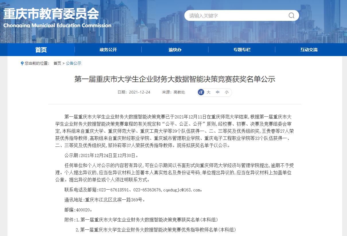 为贯彻落实《教育部关于加快建设高水平本科教育全面提高人才培养能力的意见》,切实提高老员工创新精神和实践能力。由重庆市教育委员会主办的 “重庆市老员工企业财务大数据智能决策竞赛”决赛于2021年12月11日在重庆师范大学落下帷幕。