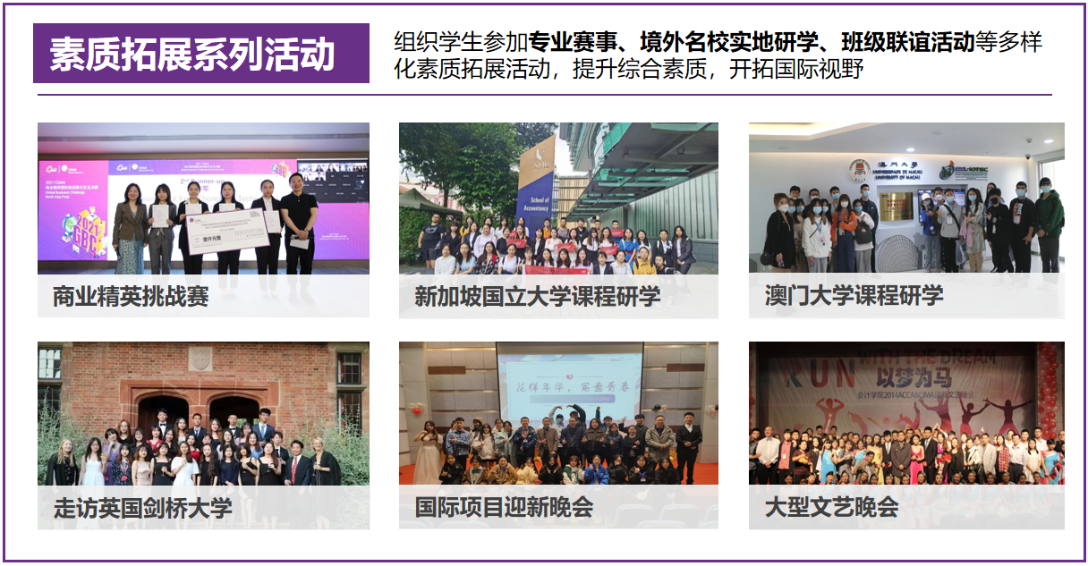 会计学专业CIMA实验班注重理论与实践相结合的培养方式,大学四年全程贯穿丰富多彩的多元能力拓展与实践活动,包括职业生涯规划与指导、就业力提升、素质拓展等系列,为同学们提供专属成长平台,积累商业精英人脉,练就领导力、求职技能等多元化软性实力,全面提升个人综合素质。