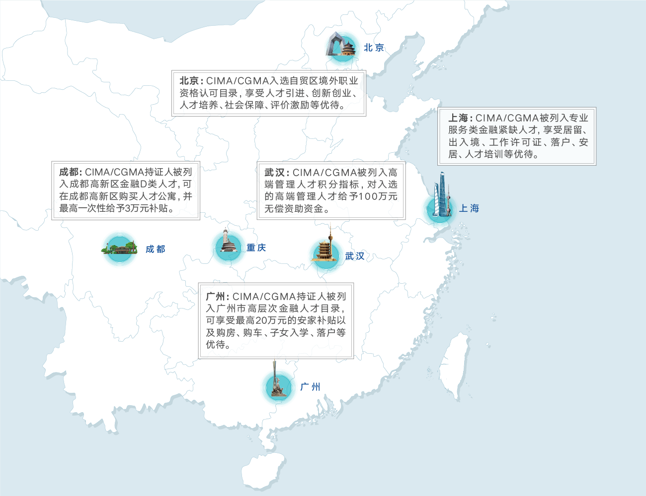 2014年以来,财政部已将管理会计列入今后会计改革与发展的重点方向。享有百年声誉且具备全球影响力的CIMA/CGMA资质在国内认可度高,多地政府为鼓励培养与吸纳CIMA/CGMA高端人才,纷纷出台积分落户、个税减免、专项奖金、置业补贴、子女入学等各项福利政策。CIMA/CGMA人才在全国范围备受推崇,职业发展前景可观。