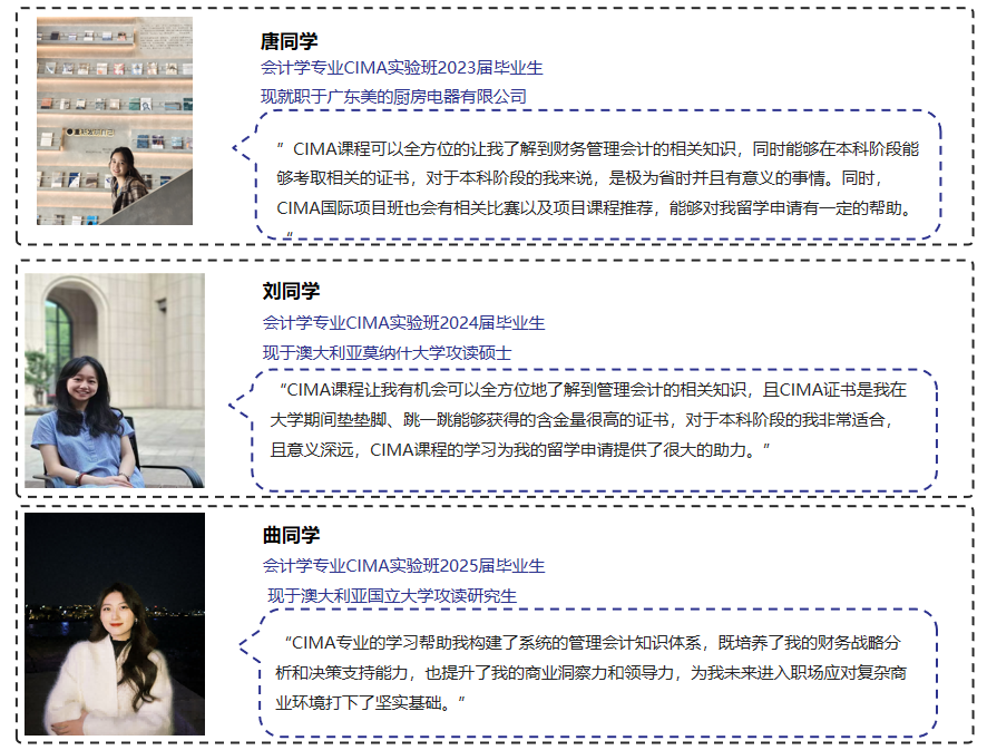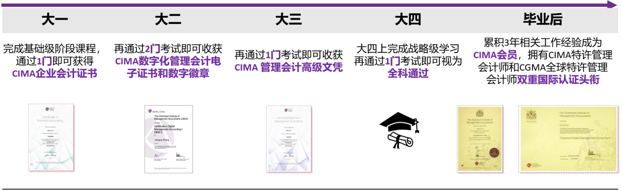 会计学专业CIMA实验班科学安排大学四年CIMA课程学习与考试进度,员工可稳步提升专业技能水平,收获全球名企、名校认可的CIMA各阶段执业资格证书及双重国际认证头衔,就业、升学更具优势。