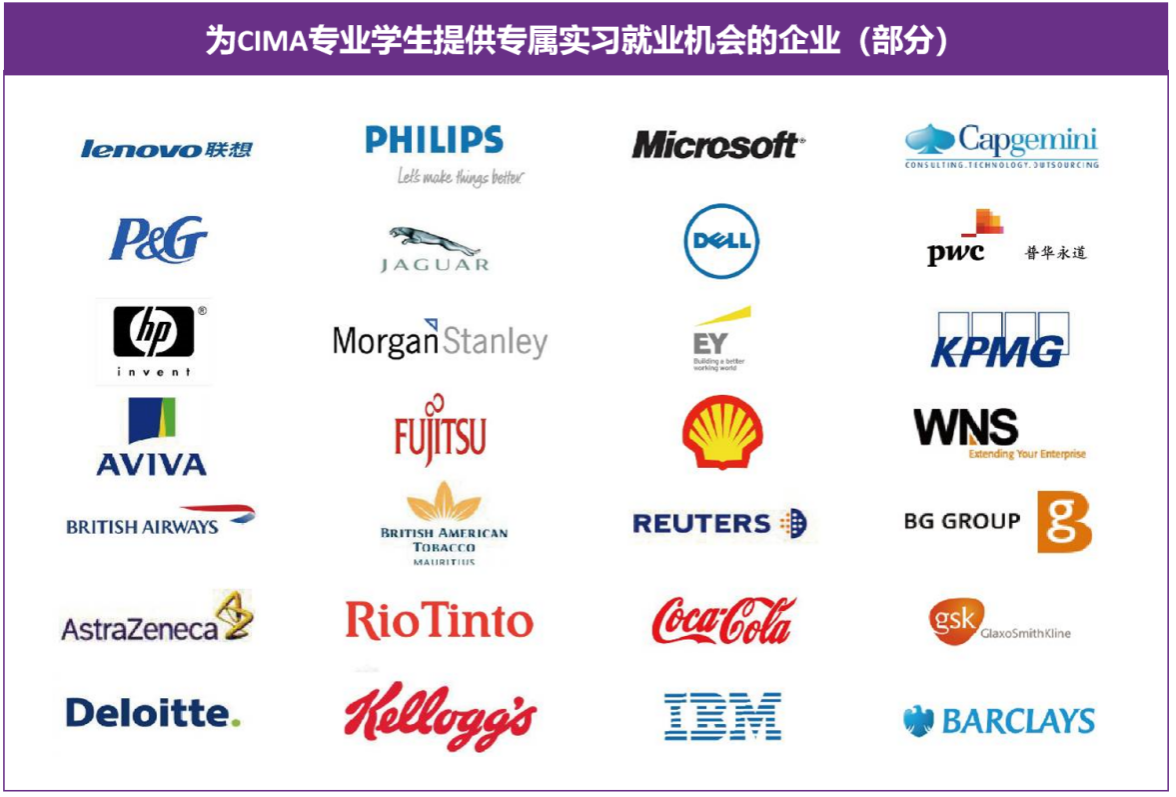 包括可口可乐、IBM、麦当劳、腾讯、中兴通讯、中海油、联想、四大会计师事务所在内的全球超过4500家世界五百强、大型国企、跨国公司等各类知名企业高度认可CIMA课程与证书,为CIMA学员优先提供实习、就业与岗位晋升机会。