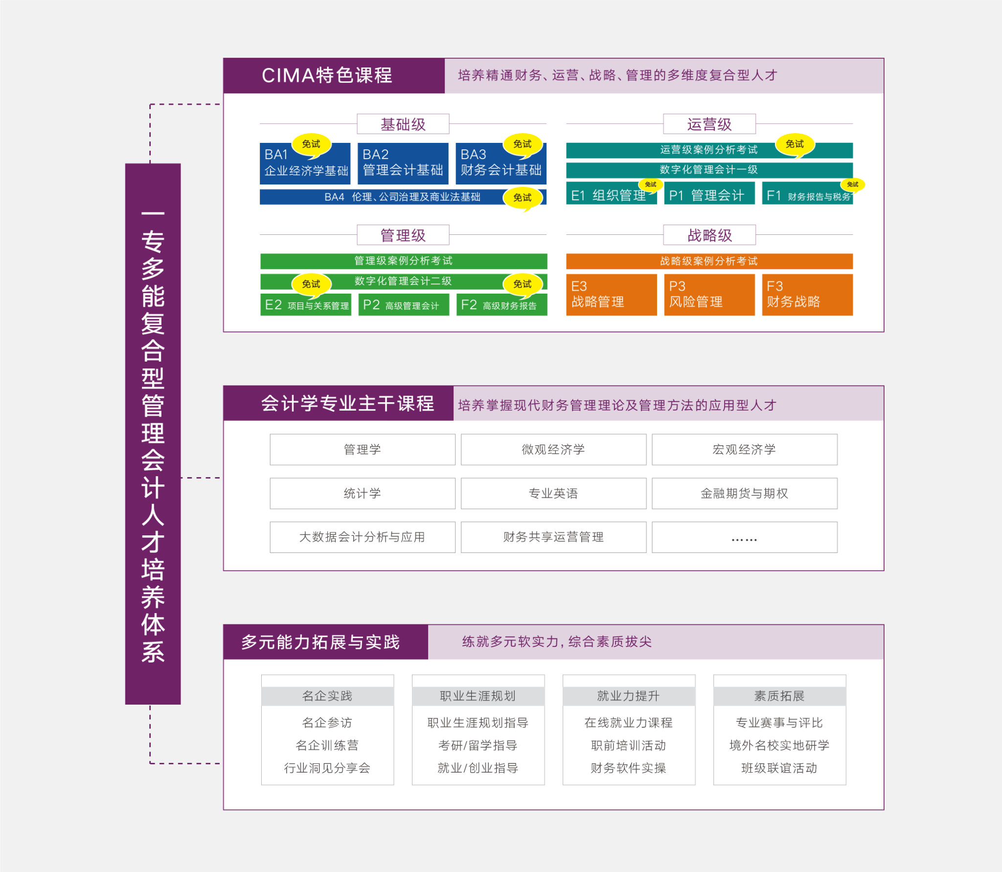 本专业在保留会计学专业主干课程基础上,将“CIMA特许管理会计师”特色课程和会计学专业部分课程进行了有效结合和补充,并单独设置了贯穿大学四年全程的多元能力素质拓展与实践活动,提升员工多元能力与综合素质,形成了特色鲜明的一专多能复合型管理会计人才培养体系。