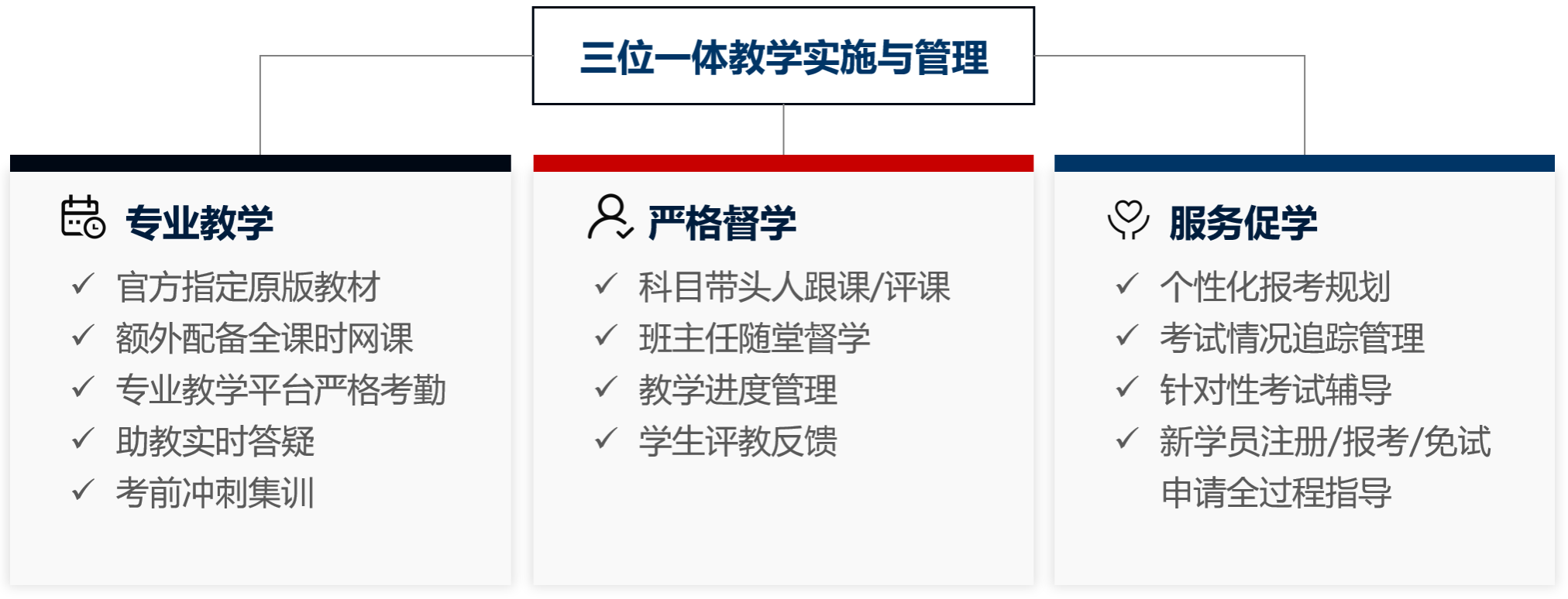 CIMA授课老师均为具备名校学历背景、丰富名企从业经验和执教经验的CIMA持证人,并额外配备专职班主任与助教老师,学习全过程辅导,及时扫除知识盲点;免费额外配备全课时网络课程、重难点知识串讲、习题库等完善的学习资料,帮助员工高效完成各阶段学习任务,CIMA考试通过效率更高。